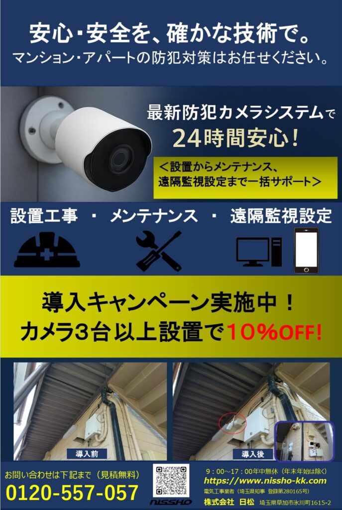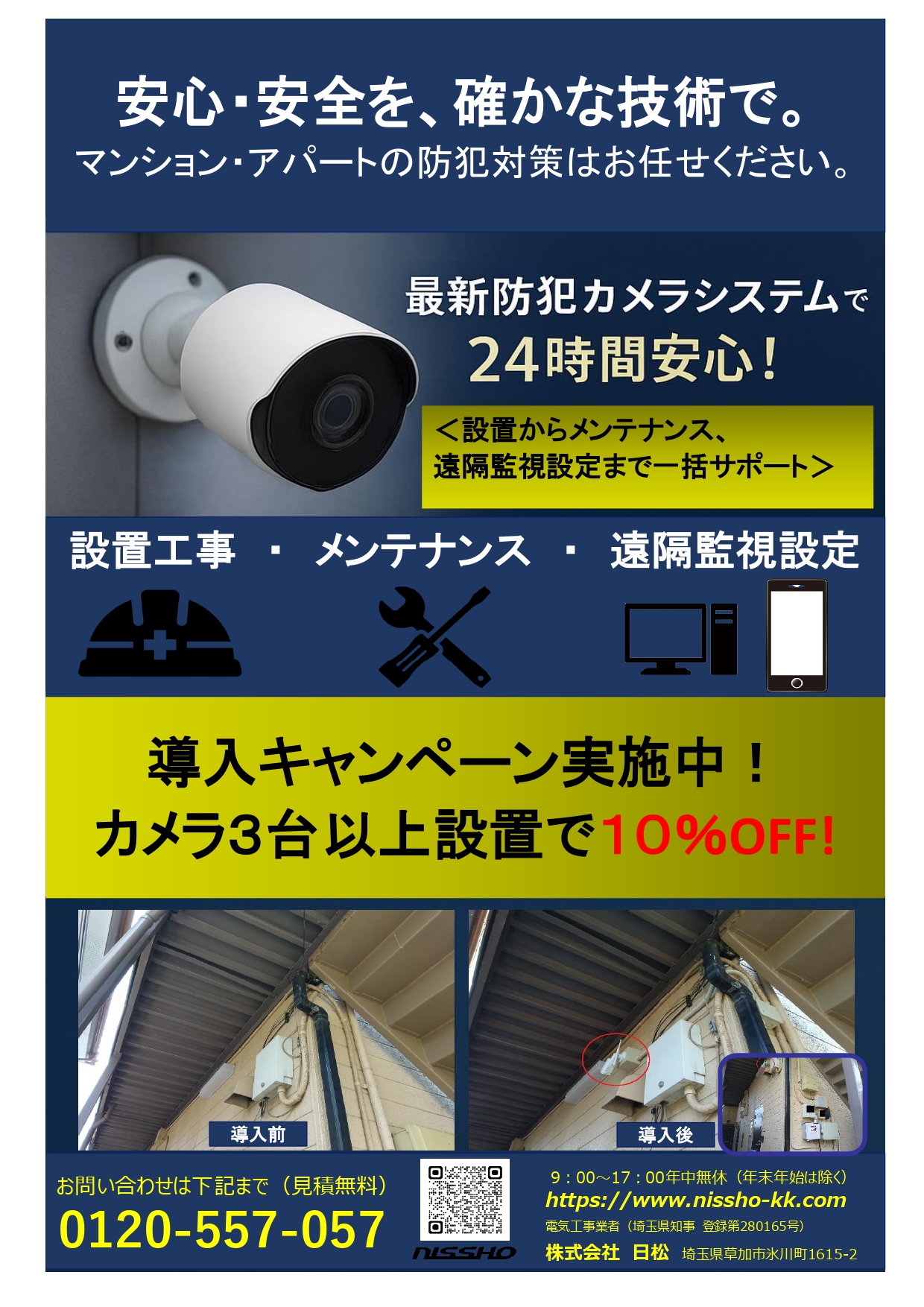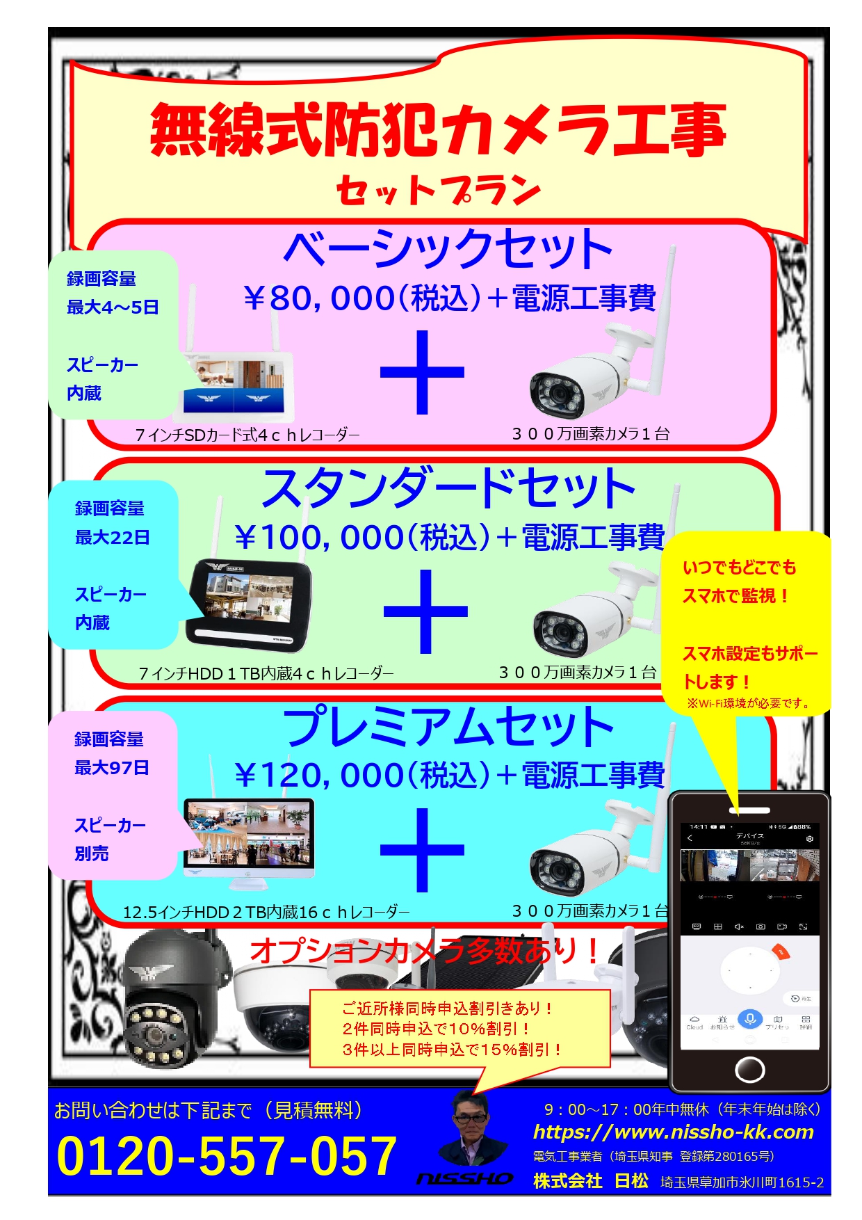 埼玉県草加市の株式会社日松はセキュリティ対策(ワイヤレス防犯カメラ)販売施工、テレビアンテナ設備工事、テレビ電波障害対策工事業者、福祉機器(階段昇降機・段差解消機)販売施工です。