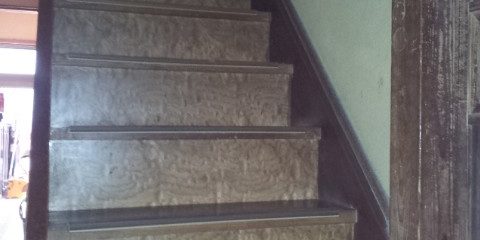階段の踏み面にレール固定用のブラケットを取付けます。