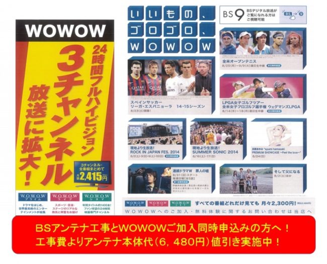 【BSアンテナ工事をご検討されている方へ】 「BSアンテナ工事」と「WOWOW加入」を当社へ同時申込みで 工事費割引きサービスを実施しております。 お手持ちのテレビリモコンに「BS」と「CS」のボタンが あれば、テレビは…